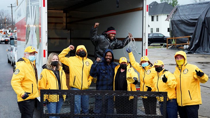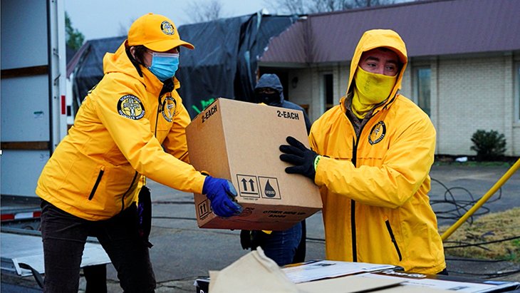 A U-Haul filled with 100 generators, heaters and propane tanks pulled up to the bright yellow tent at the corner of 8th and Walnut in Mayfield, Kentucky. Volunteer Ministers helped unload the truck’s precious contents, all of which found homes that day along with the 2,900 hot meals the volunteers handed out.