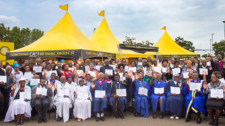 Following an extensive training program covering each of the 19 Volunteer Minister courses, 127 pastors on the outskirts of Johannesburg celebrate their newfound knowledge in a moving graduation ceremony.