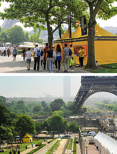In the shadow of Paris’s Eiffel Tower are the Trocadéro Gardens. Created for the Universal Exposition of 1937, the gardens feature the Warsaw Fountains, with 20 water cannons putting on their daily water display. Gracing the Trocadéro recently was our Volunteer Ministers’ yellow tent, offering help and solutions to Parisians and tourists alike.