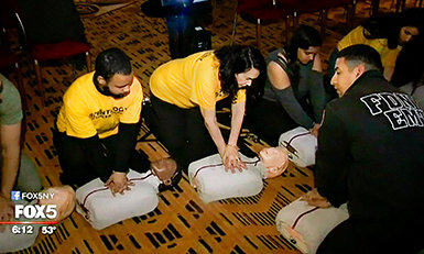 An EMT/CPR instructor taught and drilled attendees on the full CPR procedure using CPR dummies. Channel 5 Fox News attended and aired the training, including interviews with Volunteer Ministers who spoke on the value of VM technology and how VMs handle situations when people need help.